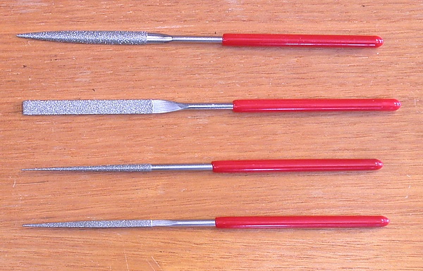 Существуют напильники (особенно надфили), покрытые алмазным порошком. Применяются для обработки закалённой стали, стекла, керамики и т. п. При работе их необходимо обильно смачивать водой.