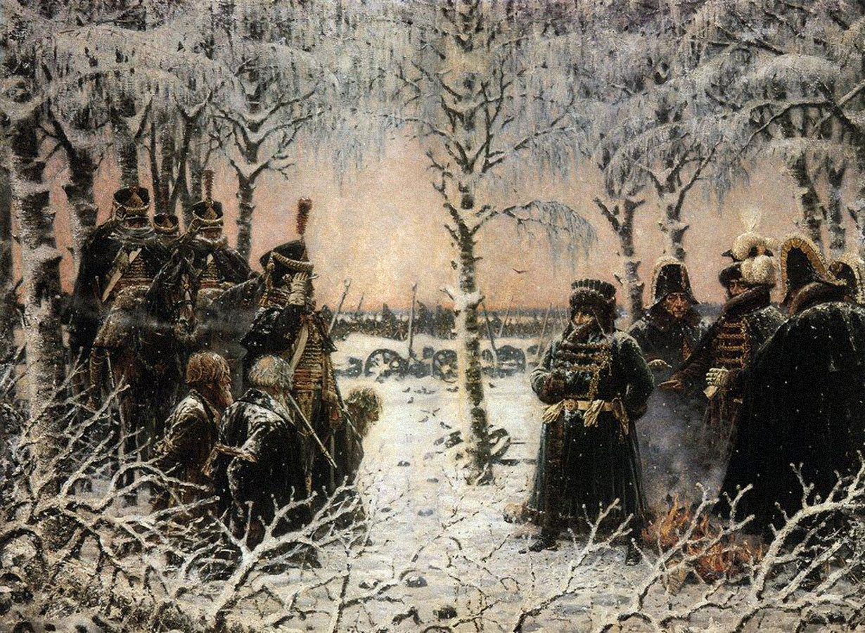 | 19 | «С оружием в руках — расстрелять!» | Наполеон, отвлекшись от костра, где он грелся с Мюратом, приговаривает партизан к смерти[2]. | 1887—1895 | |