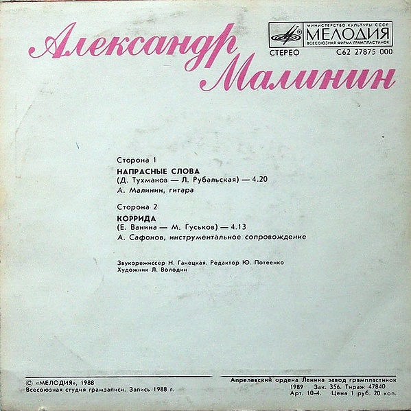 В 1988 году Всесоюзная фирма грампластинок «Мелодия» выпустила на Апрелевском заводе грампластинок тиражом 50 000 экземпляров грампластинку (мини-альбом) Александра Малинина, названную соответственно «Александр Малинин», с двумя песнями — «Напрасные слова» и «Коррида» (музыка Елены Ваниной, слова Михаила Гуськова). Звукорежиссёром записи была Наталья Ганецкая.