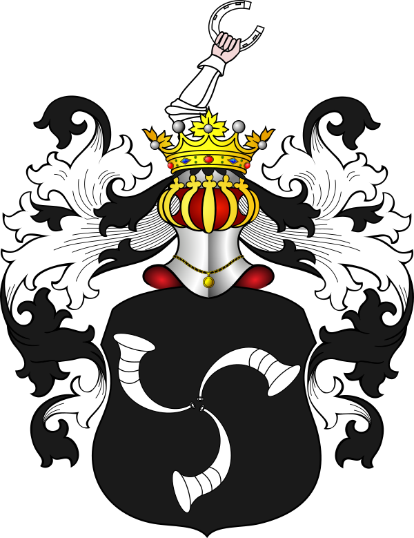Щит увенчан дворянским шлемом и короной. Нашлемник: рука в латах, держащая подкову. Намет на щите чёрный, подложенный серебром[1].