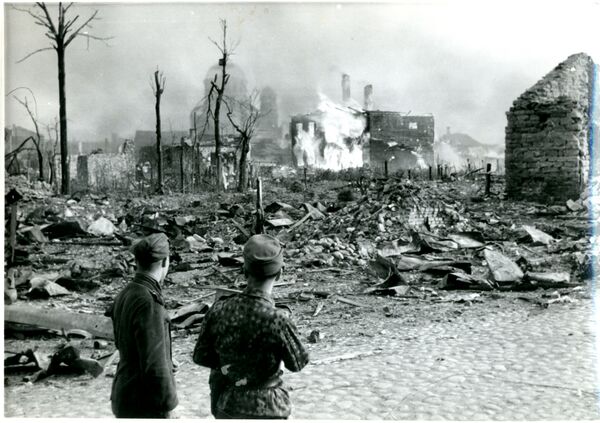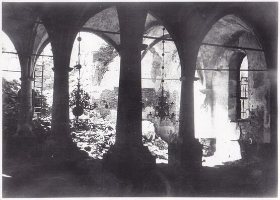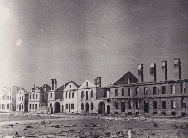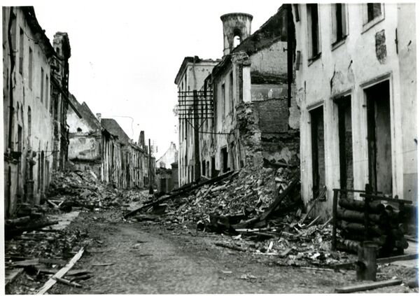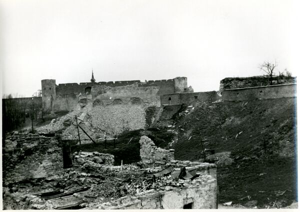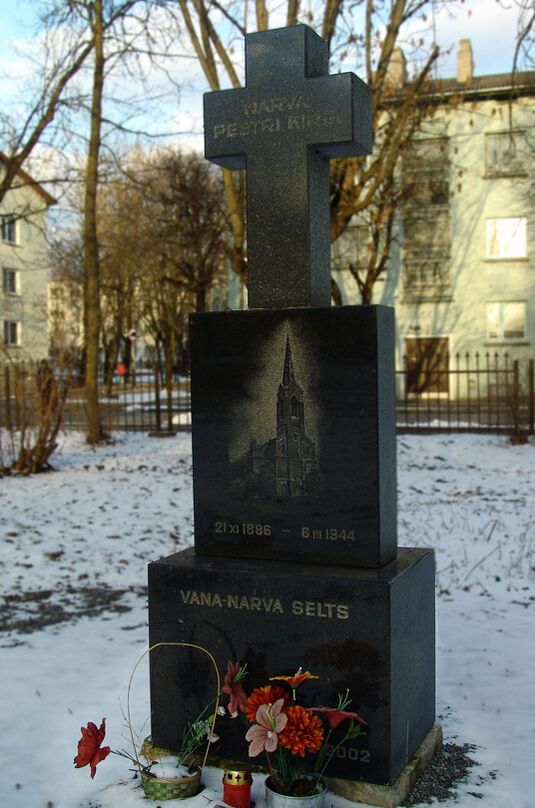 Однако в 1944 году штурмующими Нарву советскими войсками, а также отступающими немецкими войсками 98 % зданий города были разрушены (по мнению некоторых немецких историков, 85 % от этого числа приходится на долю советской армии, 15 % на долю немецких войск)[39]. Большинство строений Старого города Нарвы после войны так и не были восстановлены, а большинство коренного населения было вынуждено бежать из города или погибло. Те, кто остался в городе и его окрестностях до января 1944 года (около 20 тысяч человек), были эвакуированы немцами под угрозой расстрела, так как жители не хотели уезжать. Это произошло до 6 марта, когда началась массированная бомбардировка позиций немецких войск, включая Нарву[39]. В память об этих событиях в Нарве установлен памятный камень недалеко от городской поликлиники (в Старом городе).