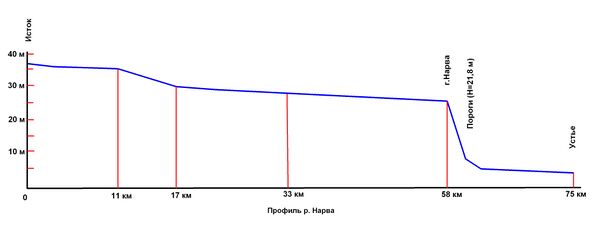 - Падение реки — 30 м, из них 19 % (4—7,5 м) приходится на Нарвские водопады, а 16 % (5 м) на Омутские пороги.