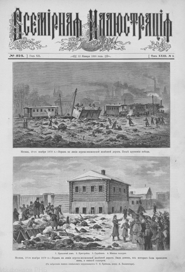 В ноябре 1879 года были произведены три попытки подрыва царского поезда, в котором император возвращался из Крыма в Петербург. Покушение у села Гниляково под Одессой[12], которое готовили М. Ф. Фроленко, Т. И. Лебедева и Н. И. Кибальчич, не состоялось из-за изменения маршрута поезда. Вторая мина, заложенная группой А. И. Желябова под Александровском, не сработала из-за технической неисправности. Третья — под Москвой, была взорвана 19 ноября группой народовольцев (А. Д. Михайлов, С. Л. Перовская, Л. Н. Гартман, Г. П. Исаев, А. И. Баранников, С. Г. Ширяев и др.). Но и это покушение не удалось. Вопреки обычному порядку царский поезд шёл первым, и подрыв произошёл под багажным вагоном поезда свиты, шедшего вторым. Никто не пострадал.
