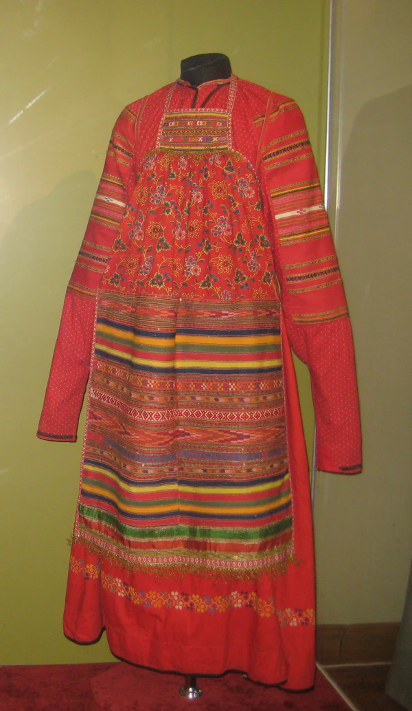 Поверх рубахи женщины надевали длинный сарафан. Застежками служили мелкие пуговицы. Повседневные сарафаны были синего цвета, праздничные — красного. В Московской губернии преобладали два вида сарафанов: саян (или кумашник) и круглый. Саян был косоклинный, его носили на распах или сшивали передние полотнища между собой. Круглый сарафан был прямым, с лямками, за пределами Московской губернии его называли московским. В XVIII в. кожаную обувь носили только городские жительницы, в деревнях были лапти, а сапоги стали частью праздничного костюма. Полушубки и суконные армяки служили верхней одеждой[2].