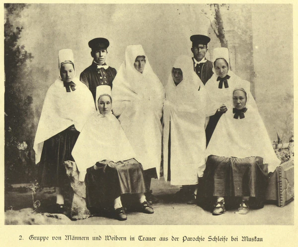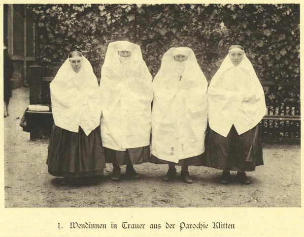 Характерной особенностью траурного лужицкого женского костюма является сочетание белого и чёрного цветов, восходящее древним славянам. Ближайшие родственники покойного во время траура носят белый плат, спускающийся ниже талии, длина которого зависит от степени траура, все остальные детали — чёрного цвета. Подобный плат, характерный для всех западных славян, также распространён и среди полностью онемечившихся лужичан. Кроме того, влияние лужицкого народного костюма в целом ощущается, помимо Саксонии и Бранденбурга (например, в Курмарке и к северу от Фюрстенберга), и в немецких народных костюмах Альтенбурга и Тюрингии, а также костюмах немецкого населения около Кросно-Оджаньске (Любушское воеводство Польши), депортированного на историческую родину после Второй мировой войны. Из-за этого, предполагается, что ранее ареал лужицкого народного костюма, и соответственно, ареал проживания лужичан мог быть шире.