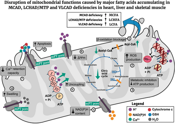 Ключевым повреждающим фактором является накопление специфичных ацилкарнитинов и жирных кислот. Эти соединения оказывают прямое токсическое действие на митохондрии, нарушая процессы окислительного фосфорилирования и выработки АТФ, что усугубляет энергетический кризис в клетках сердца, печени и скелетных мышц. Накопленные метаболиты запускают мощный окислительный стресс. В клетках повышается концентрация активных форм кислорода, истощаются антиоксидантные системы и происходит окислительное повреждение липидов, белков и ДНК. Это, в свою очередь, вызывает глубокое нарушение липидного состава клеточных мембран, меняя профиль фосфолипидов и сфинголипидов, что дополнительно дестабилизирует работу клеток[8][9].