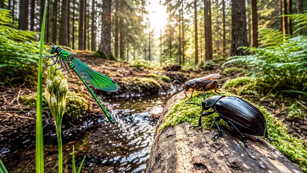 - насекомые — санитары водоёмов питаются взвешенными или осевшими на дно гниющими органическими веществами (детритом) — личинки комаров-дергунов, или звонцов, подёнок, ручейников очищают воду и служат биоиндикатором её санитарного состояния.