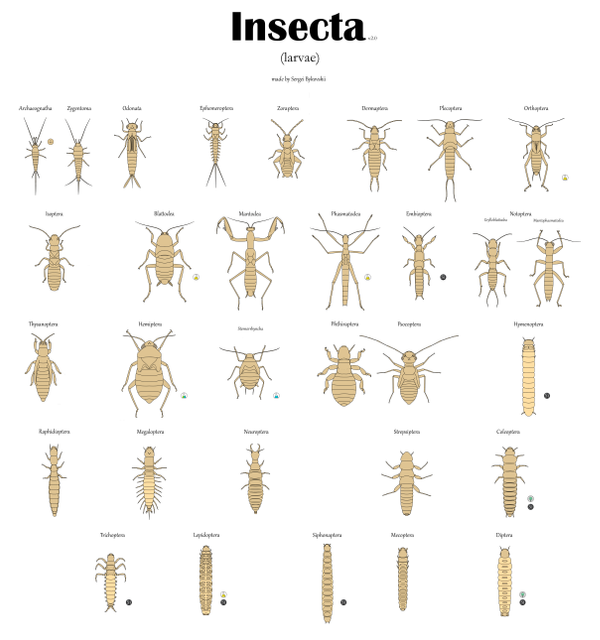 У насекомых с полным превращением личинки обычно имеют червеобразную форму тела, и только имаго обладают всеми особенностями, характерными для отряда. У большинства видов насекомых с неполным превращением имаго и личинки ведут сходный образ жизни. Личинки насекомых весьма разнообразны, но могут быть сведены к двум основным типам — сходным со взрослой особью и несходным; первые называются нимфами, вторые — истинными личинками. Нимфы сходны со взрослой стадией как морфологически, так и биологически: они живут обычно в той же среде, что и имаго, и сходно питаются. Истинные личинки резко отличаются от взрослых особей внешним видом, средой обитания и пищей. Именно таким личинкам для превращения во взрослое насекомое требуется стадия куколки. У некоторых водных насекомых превращение личинок в имаго проходит через промежуточную стадию — субимаго[1]. Оно имеет внешние особенности взрослых насекомых, но не развито в половом отношении[2][32].