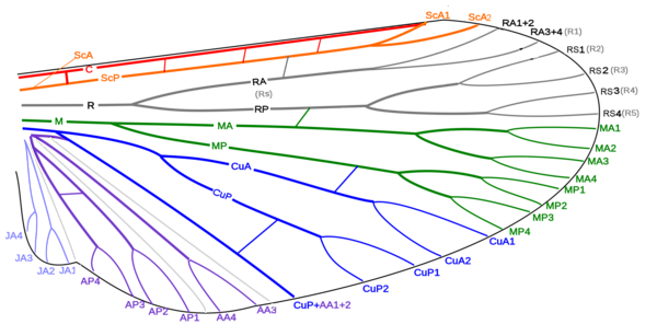 В исходном состоянии различают следующие продольные жилки: костальную (costa, или C); субкостальную (subcosta, Sc); радиальную (radius, R), снабжённую сзади ветвью — радиальным сектором (radii sector, RS); срединную (media, M), иногда делится на переднюю (MA) и заднюю (MP) ветви; кубитальную (cubitus, Cu), в числе двух, нередко сближенных жилок — передней (CuA) и задней (CuP); анальные (analis, A).