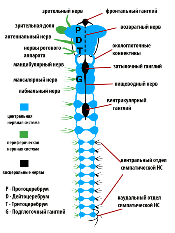 Вегетативная нервная система иннервирует внутренние органы. Она состоит из трёх отделов — краниального, туловищного и каудального[33]. Краниальный отдел представлен стоматогастрической системой, которая иннервирует переднюю кишку и сердце. Стоматогастрическая система представляет собой соединённый с тритоцеребрумом фронтальный ганглий перед мозгом, соединённый с ним возвратным нервом затылочный ганглий за мозгом, а также кардиальные и прилежащие тела. Кардиальные тела осуществляют секрецию своих гормонов, а также накопление гормонов нейросекреторных клеток мозга. Основная функция прилежащих тел — синтез ювенильных гормонов. Туловищный отдел вегетативной нервной системы представлен непарным нервом, который считается аналогом симпатической нервной системы у позвоночных. В последнем брюшном ганглии непарный нерв образует две ветви, иннервирующие заднюю кишку и половые органы (каудальный отдел вегетативной нервной системы)[33].