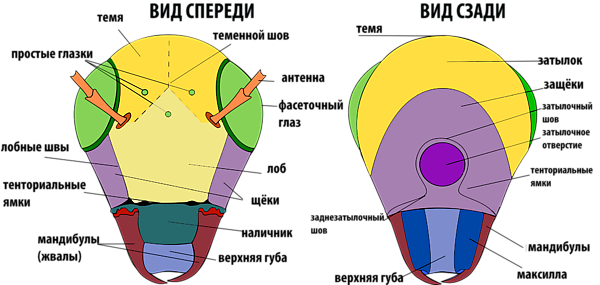Основой головы является черепная коробка (epicranium). Внутри неё есть особая скелетная структура — тенториум. На голове различают переднюю поверхность — лоб (frons), который сверху переходит в темя (vertex) и далее назад — в затылок (occiput). Спереди ото лба лежит хорошо обособленная пластинка — наличник (clypeus), далее вперёд (вниз) — верхняя губа (labrum), подвижный пластинчатый кожный выступ, прикрывающий сверху ротовые органы. На боках головы, под глазами, различают щёки (genae), сзади переходящие в виски (tempora), а снизу лежит горло (gula). С боков головы расположены фасеточные глаза (oculi), состоящие из множества зрительных единиц — омматидиев — и являющиеся основными органами зрения. Они характерны почти для всех взрослых насекомых и личинок насекомых с неполным превращением. Вторичное их исчезновение отмечается у блох и веерокрылых. Кроме этого, между сложными глазами обычно расположено от одного до трёх простых глаз, или глазков (ocelli). В зависимости от биологии положение головы неодинаково. Различают гипогнатическую голову (caput hypognathum) — с ротовыми органами, обращёнными вниз, подобно ногам, — и прогнатическую голову (caput prognathum) — с ротовыми органами, обращёнными вперёд. Первый тип обычно характерен для растительноядных, а второй — для хищных насекомых. Усики находятся по бокам лба, между глазами или впереди них, нередко в обособленной усиковой впадине. Они очень разнообразны, характерны для разных групп насекомых. В своей основе усики состоят из утолщённого основного членика, называемого рукояткой (scapus), за которым следует ножка (pedicellus) и, начиная с третьего членика, располагается основная часть — жгутик (flagellum). Различают несколько типов усиков[32].