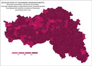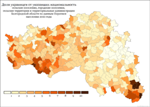 В 1926 г. на территории современной Белгородской области проживало 932 тыс. русских (57,5 %) и 683 тыс. украинцев (42,1 %). Всего через 13 лет, в 1939 г., соотношение народов меняется кардинально: 1270 тыс. русских (87,8 %) и 170 тыс. украинцев (11,7 %). В абсолютных цифрах численность украинцев за 1926—1939 гг. сократилась в 4 раза[67].