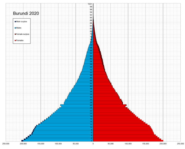 Население страны составляет 8 856 000 (2008)[1], из которых 80,9 % — хуту, 15,6 % — тутси, 1,6 % — лингала, 1,0 % — пигмеи тва. Плотность населения — 323,4 человек на км². В городах проживает 10,0 % населения страны (2005).