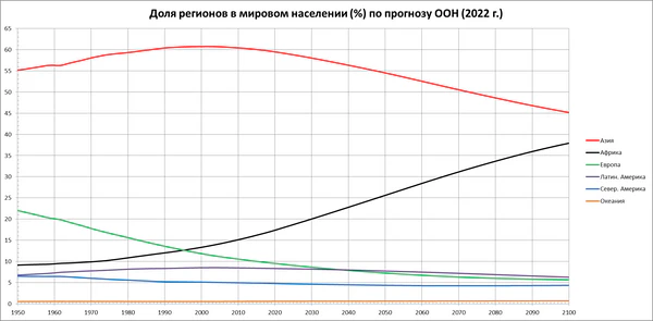 - Согласно прогнозу население Азии пройдёт максимальное значение в 2055 г. (5,3 млрд.), а население Латинской Америки и Карибского бассейна — в 2056 г. (752 млн.). После прохождения пиковых значений население этих регионов начнёт сокращаться. Для Азии, Латинской Америки и Карибского бассейна, а также Африки в течение XXI века прогнозируется большое отрицательное сальдо миграции (минус 176 млн чел. за 2022—2100 годы для этих регионов вместе взятых).