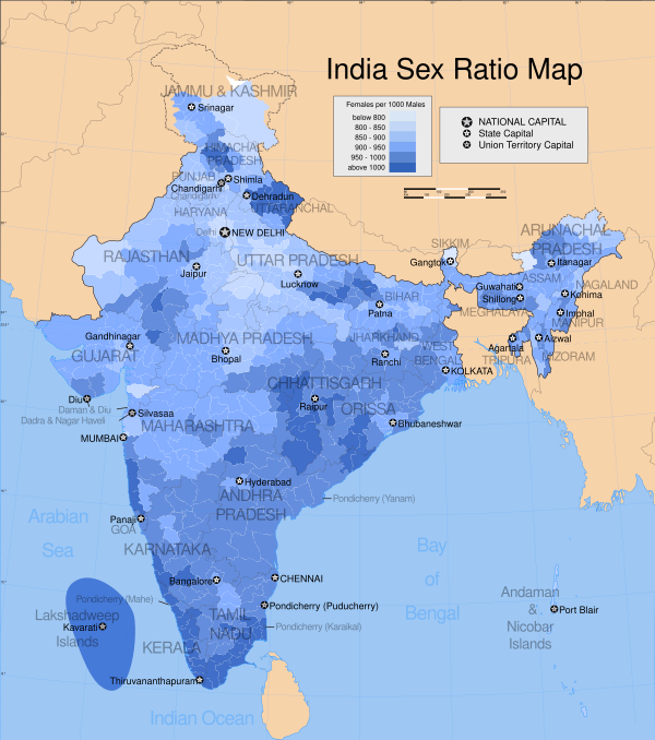 Плотность населения Индии — 411,48 чел./км², что является одним из крупнейших показателей на планете. Наибольшая плотность населения наблюдается в Западной Бенгалии — 1029 чел./км² и Бихаре — 1102 чел./км². Наименьшую плотность имеет спорная территория Аруначал-Прадеш — 16,5 чел./км².