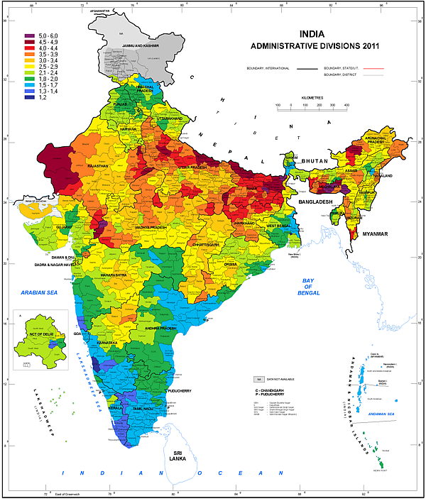 Суммарный коэффициент рождаемости в Индии и её главных штатах, 1871—2008:[12]