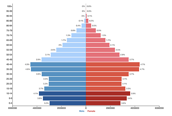 В 1950—1990-х годах страна переживала демографический взрыв. С 1979 года население удвоилось и в 2006 году достигло 70,495782 млн человек. Однако в 1990-х рождаемость заметно снизилась и теперь опустилась ниже простого воспроизводства поколений. Суммарный коэффициент рождаемости — 1,87 (для воспроизводства поколений необходимо 2,15)[16]. Более 61 % населения не достигли 30 лет (май 2009). Уровень грамотности составляет 84 %, урбанизация — 71 %.