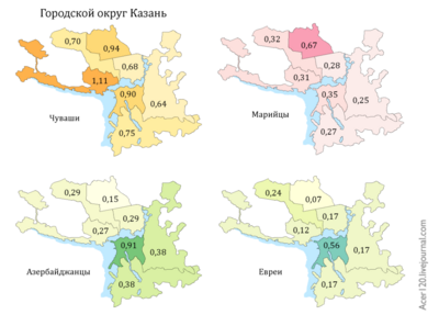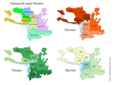 Казань является одной из самых многонациональных территорий России: представители свыше 115 национальностей проживают на территории города. Двумя крупнейшими национальностями в Казани являются русские (48,6 % или 554,5 тыс. чел. по переписи населения 2010 года) и татары (47,6 % или 542,2 тыс. чел.). Также в городе представлены чуваши (0,8 % или 9,0 тыс. чел.), украинцы (0,4 % или 4,8 тыс. чел.), марийцы (0,3 % или 3,7 тыс. чел.), башкиры (0,2 % или 1,8 тыс. чел.), удмурты (0,1 % или 1,4 тыс. чел.) и др.[55]