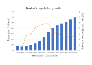 Из 100 млн мексиканцев более 50 % ещё не достигли возраста 20 лет. Прирост населения составляет 1,6 % в год.