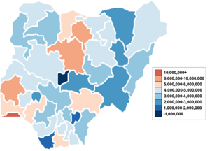 Религии: мусульмане — 53 %[9] (хауса, фульбе и часть йоруба); христиане — 45,7 %[9] — 50,8 %[10] (игбо и большая часть йоруба); традиционные религии — 1,4 %[11]. Доля мусульман имеет тенденцию к росту за счёт более высокой рождаемости.