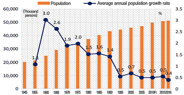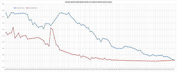 В Южной Корее в 2020 году была зафиксирована самая низкая рождаемость в мире — суммарный коэффициент рождаемости составил 0,84[1]. В начале 1960-х этот показатель был равен 6, однако в течение следующих 20 лет рождаемость в стране снизилась ниже уровня воспроизводства населения, а к середине 2000-х годов суммарный коэффициент рождаемости опустился ниже 1,3 (четверо детей на три семьи в среднем). Из-за быстрого старения населения число жителей страны начнет сокращаться уже в ближайшие годы, по итогам 2020 года в Южной Корее впервые в истории зафиксирована естественная убыль. При этом ожидается сокращение числа занятых, замедление экономического роста, обострение кризиса пенсионной системы.[2] Из-за того, что корейцы, как другие народы Восточной Азии (японцы, китайцы и т.д.) предпочитают селиться в плотно заселённых, крупных экономических центрах и агломерациях, где больше социально-экономических возможностей и лучше развита инфраструктура, возникают проблемы диспропорций в населённости страны. Пример план переноса столицы Республики Кореи, отчасти вызванный чрезмерной концентрацией населения в Сеульском национальном столичном регионе, где по состоянию на 2018 год, проживало 25 674 800 человек или около 50% населения Республики Корея. Что ведёт к чрезмерной перенаселённости и высокой плотности населения крупных городов, и городских агломераций, и в свою очередь депопуляции в сельской, и малонаселённой местности.[3][4]