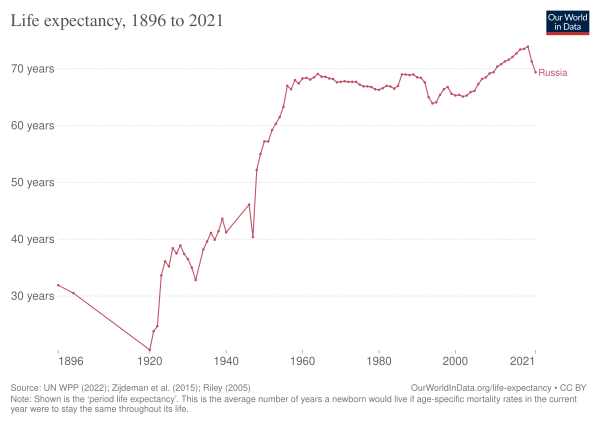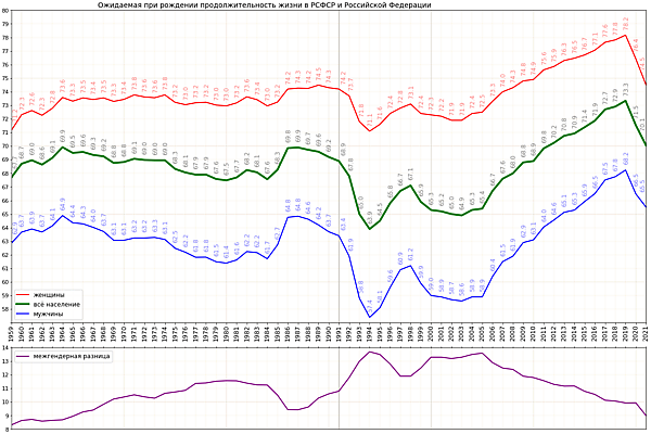 Средняя ожидаемая продолжительность жизни населения России согласно данным The World Factbook по состоянию на 2021 год: общая — 72,16 лет; мужчины — 66,61 лет; женщины — 78,05 года (159-е место в мире)[44]. По состоянию на 2021 год уровень рождаемости составляет 9,71 новорождённых на 1000 жителей (193-е место в мире)[44]. Суммарный коэффициент рождаемости (СКР) — 1,6 рождений на женщину (184-е место в мире)[44]. Из-за демографического старения населения и низкой средней ожидаемой продолжительности жизни неуклонно растёт уровень смертности, по состоянию на 2021 год уровень смертности составляет 13,4 умерших на 1000 человек (6-е место в мире)[44]. По состоянию на 2021 год уровень чистой миграции в России относительно низкий и составляет 1,7 мигранта на 1000 жителей (50-е место в мире)[44]. Ежегодный прирост населения на 2021 год составляет −0,2 % в год (207-е место в мире). По состоянию на 2021 год средний возраст женщины при первых родах в России составляет 28 лет (для сравнения в Республике Корее стране с самым низким в мире СКР — 0,84 рождений на женщину на 2020 год, средний возраст женщины при первых родах в 2019 году составлял 32,2 года)[45][46][47]. По состоянию на 2021 год в городах проживает 74,9 % всего населения, прогнозируемый ежегодный прирост достигает 0,11 %[44].