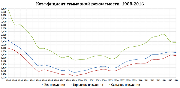 Коэффициент суммарной рождаемости в России, 1960—2019[50]: