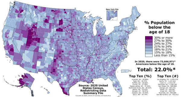 По данным на 2021 год, суммарный коэффициент рождаемости в США составляет 1,84 рождения на женщину[8]. По состоянию на 2019 год средний возраст женщины при первых родах в США составляет 27 лет (для сравнения в Республике Корее стране с самым низким в мире СКР — 0,84 рождения на женщину на 2020 год, средний возраст женщины при первых родах в 2019 году составлял 32,2 года).[8][26][27]