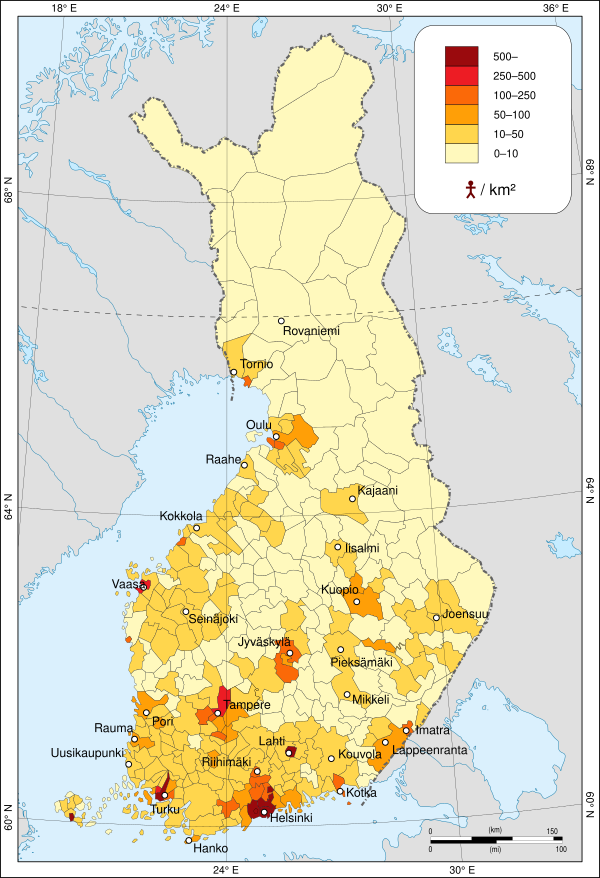Финляндия — одна из наименее населенных стран Европы; Плотность населения относительно низкая, 16,5 человек на квадратный километр. Население очень неравномерно распределено географически — большинство финнов живёт у побережья, в южной и юго-западной частях страны. В Хельсинки проживает более миллиона человек. В Лапландии в среднем проживает всего два человека на квадратный километр.