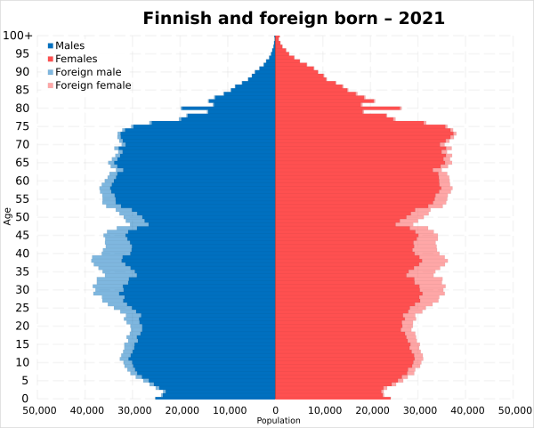 По состоянию на конец 2022 года общая численность населения Финляндии составляла 5 563 970 человек (2 753 477 мужчин и 2 810 493 женщин).[10] Население за 2022 год увеличилось на 15 729 человек[11]. Родилось 44 951 новорождённый[12], умерло 63 219 человек[13], 36 364 новых иммигрантов и 13 459 эмигранта[14]. 6 643 человека получили финское гражданство[15].