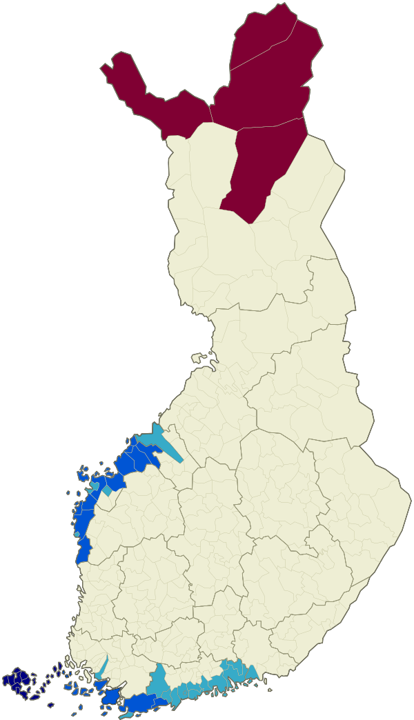 Согласно Закону о финском языке, муниципалитеты могут быть одноязычными или двуязычными — определение зависит от количества говорящих в муниципалитете. Большинство муниципалитетов финноязычные. До 2014 года на материковой части Финляндии существовало три одноязычных шведскоязычных муниципалитета, но благодаря изменениям в системе государственных взносов эти муниципалитеты также стали двуязычными[23][24]. Согласно Закону о самоуправлении Аландских островов, все муниципалитеты на Аландских островах шведскоязычные,[25] хотя менее пяти процентов носителей языка на Аландских островах говорят на финском языке (2019)[21].