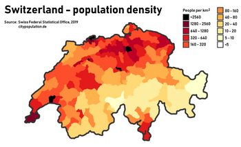В Швейцарии относительно высок уровень урбанизации — 74 % населения в 2021 году проживало в городах.[5] Около трети всего населения Швейцарии проживает в 5 крупнейших городах: