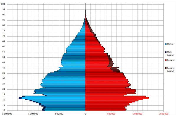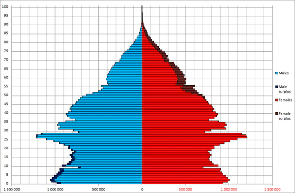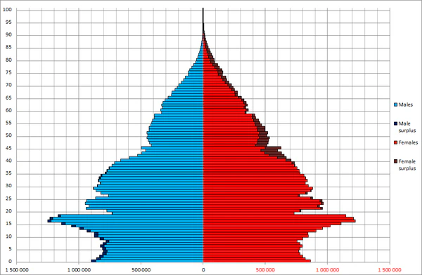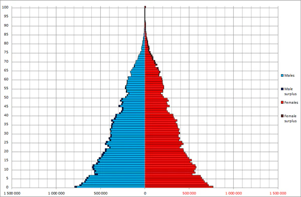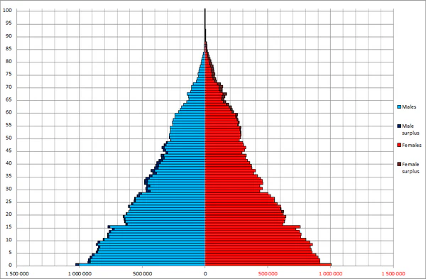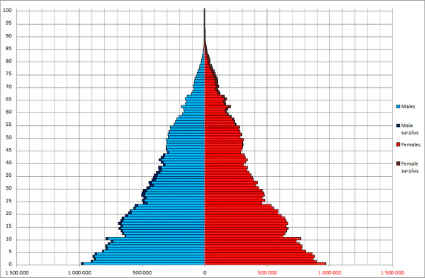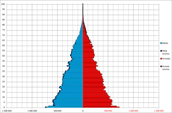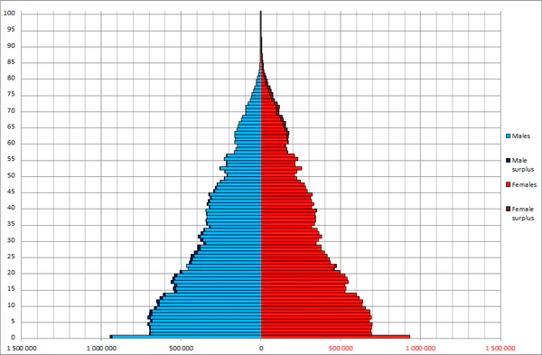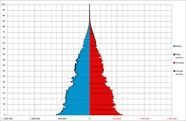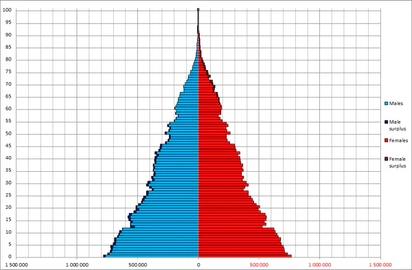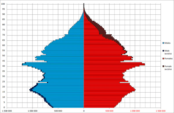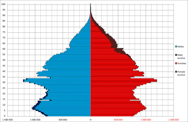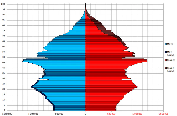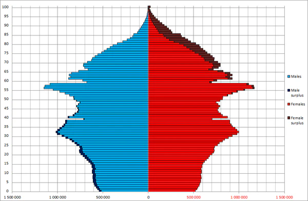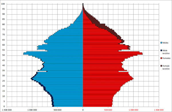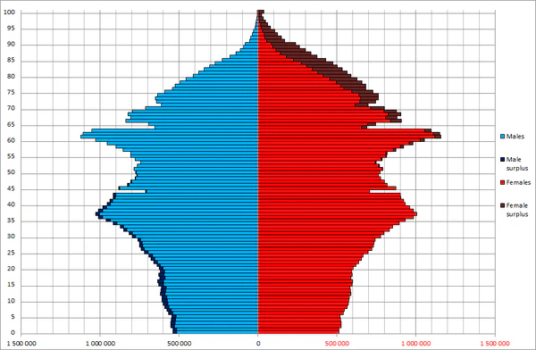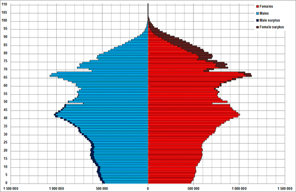 - Численность мужского населения составила 60 233 тыс. человек, уменьшившись на 260 тыс. человек (0,43 %), а численность женского населения составила 63 569 тыс. человек, уменьшившись на 290 тыс. человек (0,45 %).