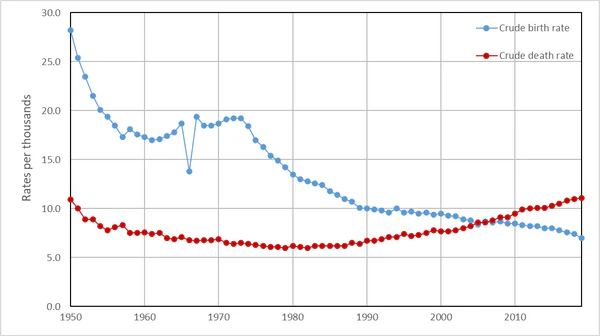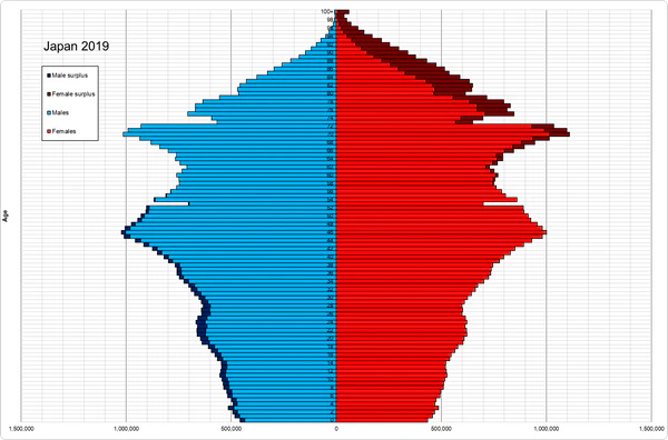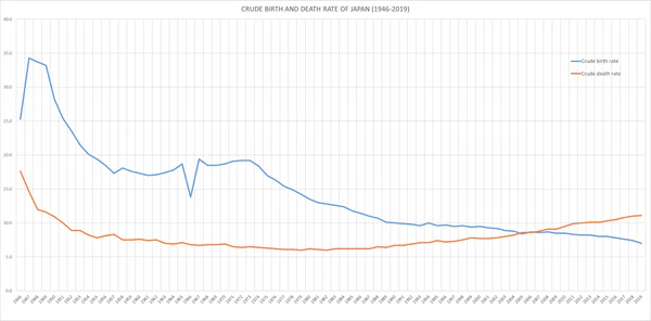 В 2005 году население Японии впервые уменьшилось, так как уже долгое время рождаемость в стране находится на уровне ниже простого воспроизводства населения (1,4 ребёнка на женщину). Япония, которая практически не принимает иммигрантов, окажется в перспективе в прогнозируемом демографическом кризисе, при котором малое количество работающих должно будет содержать большую массу пенсионеров.