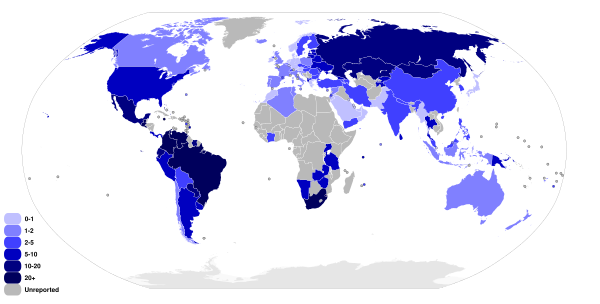 Абсолютное число убийств во всём мире составило в 2000 году, по оценкам, более 500 000[9]. Относительные показатели числа убийств в разных странах существенно отличаются. В большинстве развитых стран совершается 1—4 убийства на 100 000 человек населения; самые низкие показатели наблюдаются в Японии, Ирландии и Исландии (около 0,5); выше среднего этот показатель в США (5,5)[10]. В России в 2009 году было совершено 17 681 убийство, что соответствует уровню 12,5 на 100 000 населения[11]. В развивающихся странах уровень убийств ещё выше, он может достигать 40—50 на 100 000 населения или даже более высоких значений.