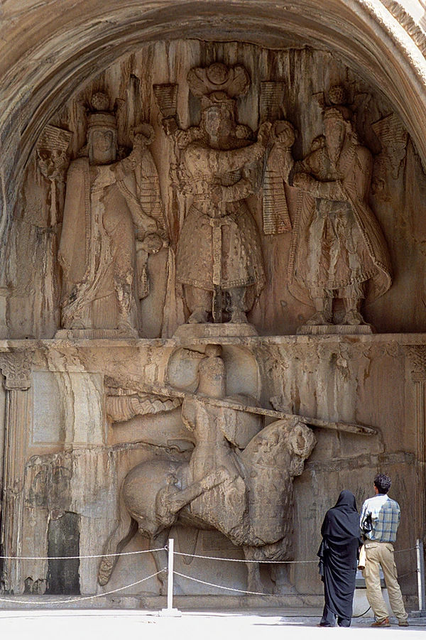 Чуть ниже гробниц Ахеменидов, на уровне земли, находятся наскальные рельефы с крупными фигурами сасанидских царей, одни из которых встречаются с богами, другие сражаются. На самом известном из них изображён сасанидский царь Шапур I на коне, перед ним склонился в покорности римский император Валериан, а Филипп Араб (более ранний император, который платил Шапуру дань) держит коня Шапура, под ним лежит мёртвый император Гордиан III, убитый в бою (предлагались и другие варианты). Это памятник битве при Эдессе в 260 году н. э., когда Валериан стал единственным римским императором, захваченным в плен, что стало для римлян неизгладимым унижением. Размещение этих рельефов явно указывает на намерение Сасанидов связать себя со славой более ранней империи Ахеменидов[8]. В Персеполе находятся ещё три ахеменидские царские гробницы с подобными рельефами, одна из которых не достроена[9].