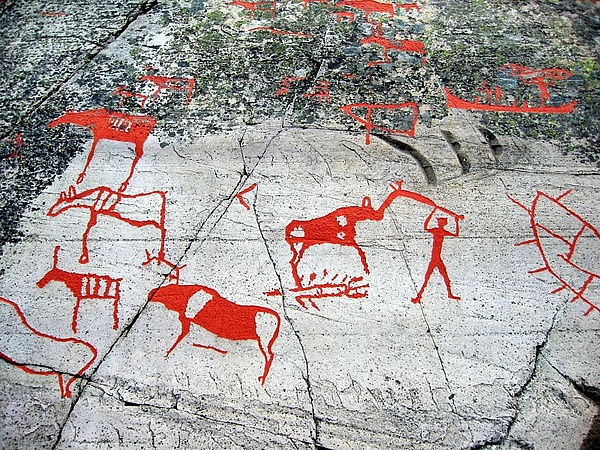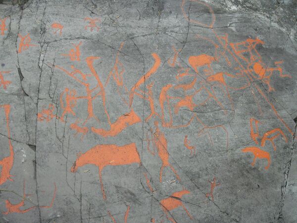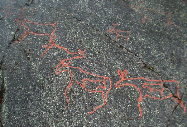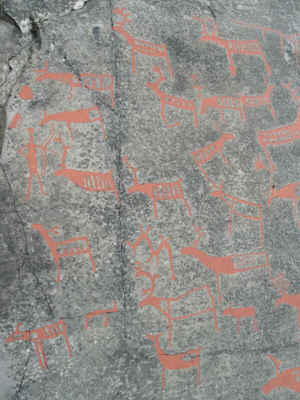На скальных рисунках можно найти широкий спектр животных. Среди них преобладает изображение оленей, зачастую они объединены в большие стада, на которые ведется охота. Изображения оленей за забором, по-видимому, указывают на то, что определенный контроль над этими животными существовал с давних времен. Кроме оленей часто можно найти изображения лосей, различных видов птиц и рыб. Беременные животные часто изображались с плодом видимым внутри своей матери.