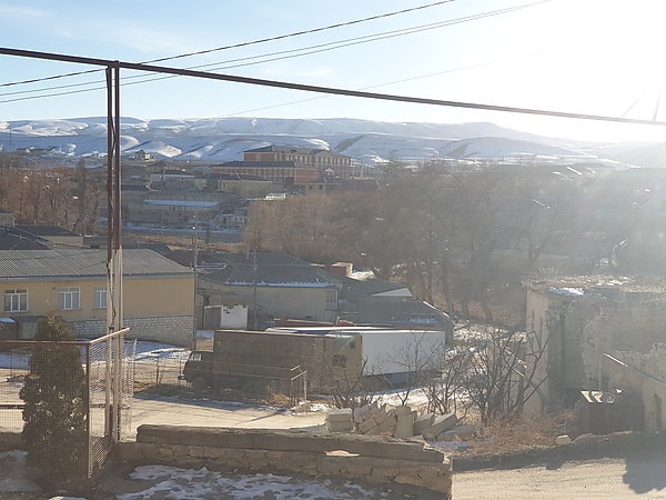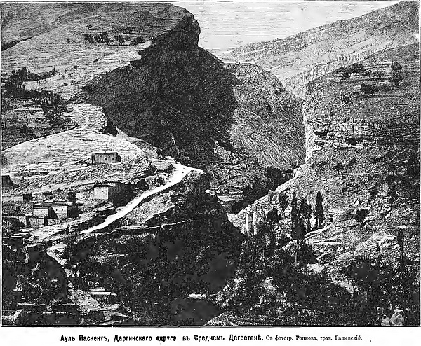 Читатель по самой фотографи может судить об его обстановке: скалы, камни, утесы: растительности очень мало; сакли разбросаны кое-где и как попало. Спросят, чем же эти люди живут, и какова их культура? На это мы ответим, что аул Наскент, в котором считается 924 души обоего пола расположен на истоке реки Гуден-Озень: она на фотографии видна и находится в глубине ущелья. По берегам её и возникла местная культура. Тут человек искусственно создал почву из навоза и земли нанесенной с разных мест горстями. На этих, так сказать, парниках и держится вся культура идёт сравнительно очень далеко: хлебные растения, овощи, плодовые деревья, вы всё тут найдёте