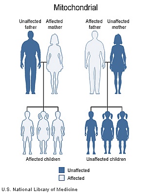 Насле́дственная опти́ческая нейропати́я LHON Ле́бера, или атрофи́я зри́тельного не́рва Ле́бера, является наследственной (передаётся от матери к потомству) митохондриальной дегенерацией ганглионарных клеток (РСК) сетчатки и их аксонов, что приводит к острой или почти острой потере центрального зрения; это влияет преимущественно на молодых мужчин. Тем не менее, LHON передаётся только по материнской линии, прежде всего, из-за мутаций (не ядерных) в митохондриальном геноме, и только яйцеклетка способствует митохондрии в зародыше. LHON, как правило, связана с одной из трёх патогенных митохондриальных ДНК (мтДНК) точечных мутаций. Эти мутации действуют на нуклеотиды и репозиционируют 11778 G в А , 3460 G в А и 14484 T в C, соответственно, в ND4, ND1 и Nd6 субъединицах генов в комплексе I окислительного фосфорилирования цепочек в митохондриях. Мужчины не могут передать болезнь своему потомству[1].