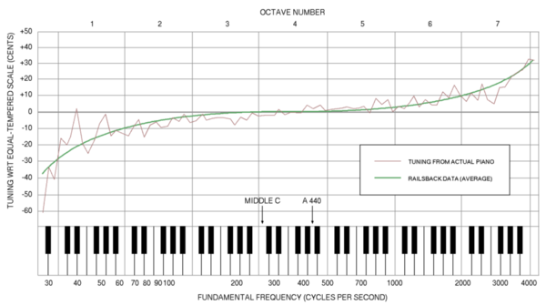 В 1937 году американский ученый О. Л. Рейлсбек опубликовал результаты своих инструментальных измерений точности строя фортепиано[2]. Рейлсбек испытал большое число пианино и роялей, в том числе относящихся к премиум-классу, настроенных высококвалифицированными настройщиками, сразу же после настройки. Обработка этих результатов позволила построить т. н. кривые Рейлсбека, представляющие собой измеренные отклонения основных тонов настроенного инструмента от равномерной темперации. Как правило, отклонения увеличиваются к краям диапазона в сторону расширения интервалов, то есть дискант повышается, а бас понижается. В пересчете на октаву это расширение составляет от 0 до ± 6 центов в середине и от ± 3 до ± 24 центов к краям диапазона. С некоторым приближением к равномерной темперации согласуется лишь участок среднего регистра, примерно от ля малой октавы до ля второй октавы. То есть практическая частота настройки будет составлять