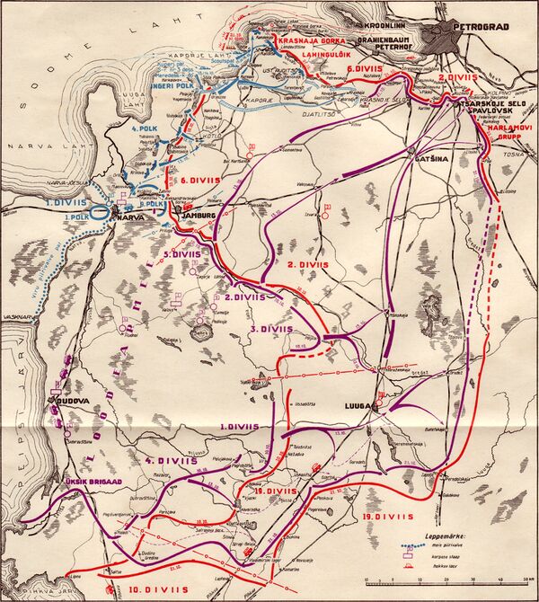 1-я Эстонская дивизия располагалась в районе Ингерманландских озёр и держала линию фронта от Копорского залива до железной дороги Ямбург — Гатчина, примыкая своим правым флангом к левому флангу Северо-Западной армии. Из состава дивизии в распоряжение командования СЗА был выделен всего один, правда считавшийся лучшим во всей армии, «Балтийский полк».[6][7]