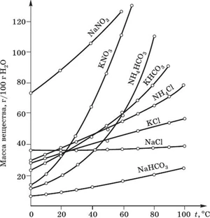 Кривые растворимости отображают зависимость растворимости вещества от температуры. На графике показано, как при изменении температуры меняется максимальное количество растворённого вещества в насыщенном растворе[1].