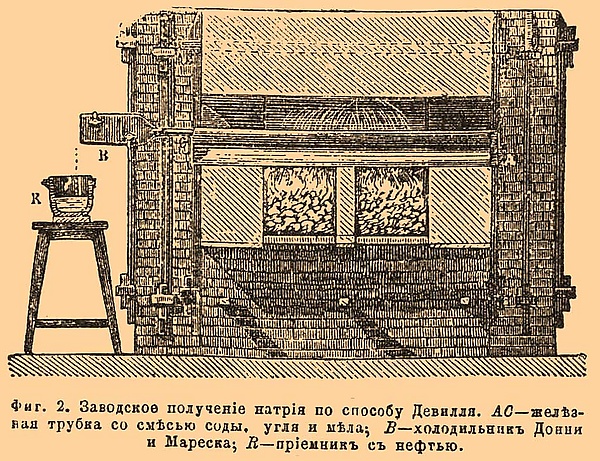Первым промышленным способом получения натрия была реакция восстановления карбоната натрия углём при нагревании тесной смеси этих веществ в железной ёмкости до 1000 °C (способ Девилля)[17]:
