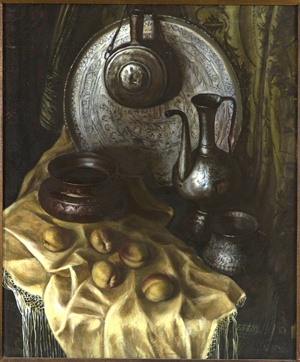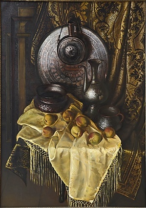 Композиция натюрморта включает старую медную посуду, размещённую на фоне светлой драпировки с орнаментом, лежащей на разложенном белом платке из шёлка с кистями. На фоне гравированного подноса свисает медная фляжка; слева расположена большая чаша, справа — кувшин и кружка. На переднем плане разложены пять персиков.
