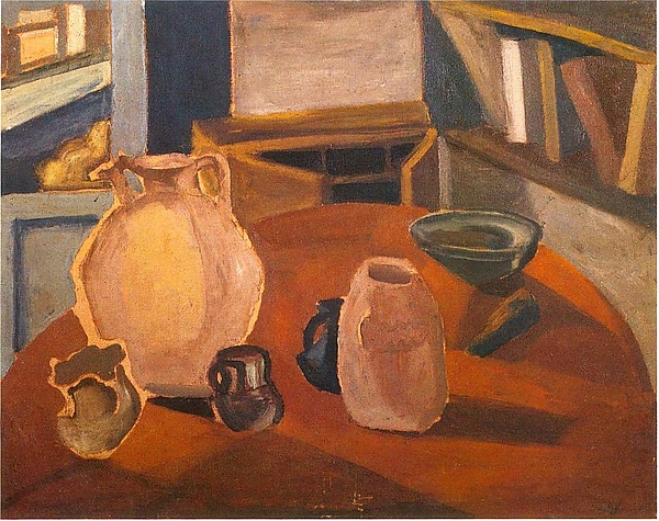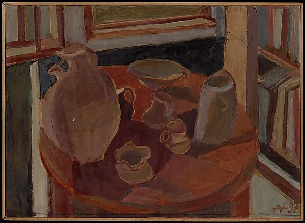 В центре композиции размещён овальный коричневый стол, на котором расположены предметы из керамики: высокий светло-коричневый сосуд с ручками, три небольшие тёмные вазочки, вытянутый сосуд, а также чаша и осколок. На втором плане изображены книжный шкаф справа и серый шкаф с открытой дверцей слева, между которыми стоит ещё один коричневый стол с раскрытыми дверцами. В правом нижнем углу полотна видна надпись «AN».