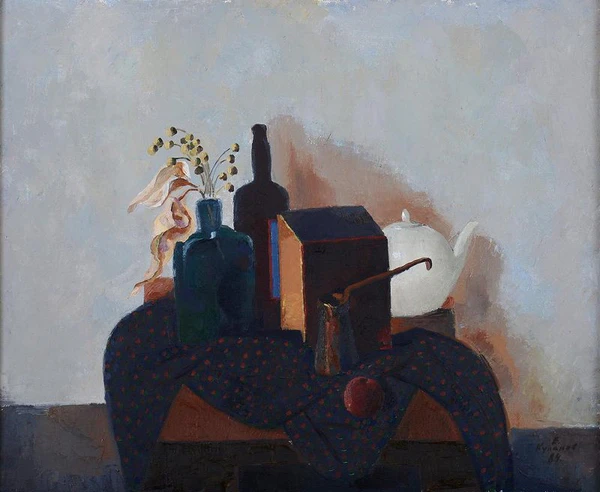 Натюрморт выполнен в технике холст, масло на холсте размером 72×89 см. На полотне изображена группа предметов — кофеварка, чайник, коричневая бутылка, коробка и массивная зелёная бутыль с сухими цветами, расположенные на столе, покрытом сине-зелёной тканью в красный «горох». На обороте холста чёрным цветом нанесена надпись «Кулаков В. А. 1939 г.р. Натюрморт с белым чайником. Х.м. 1984 г. 72×89 см». На подрамнике указан инвентарный номер «7120/87 МГОХФ № 7337 м».