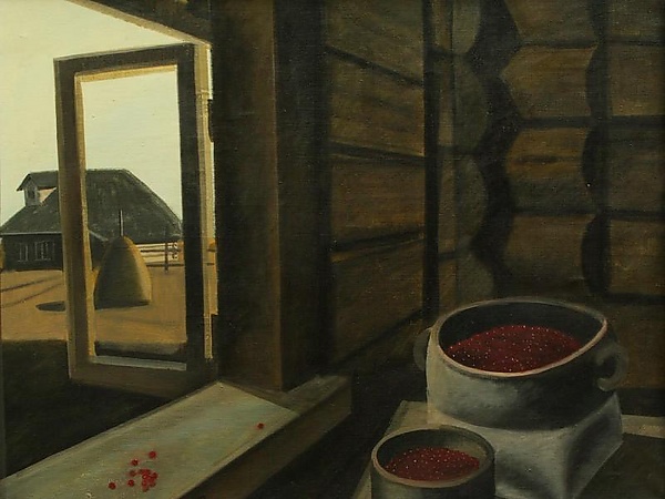 На картине представлен натюрморт: на первом плане, на столе у окна, изображены две чаши с ягодой, одна из которых — большая и с ручками — расположена выше другой. На подоконнике рассыпана горсть брусники. Фоном служит угол бревенчатой избы с открытым окном, через которое видны стог сена и сельский дом, типичные для сельской местности. Работа выполнена в серо-коричневых оттенках, что придаёт композиции сдержанность и гармонию в цветовой гамме. Изображение отличается вниманием к деталям и реалистической манерой исполнения, характерной для реализма.