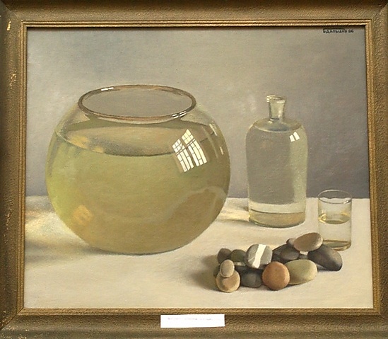 На беловато-серой поверхности в правой части переднего плана размещена небольшая кучка речной гальки различных оттенков. В центре композиции представлены наполненные водой стеклянные предметы, расположенные слева направо: круглый аквариум, небольшая бутыль и стакан. Дальний план картины занимает однотонный серый фон стены.