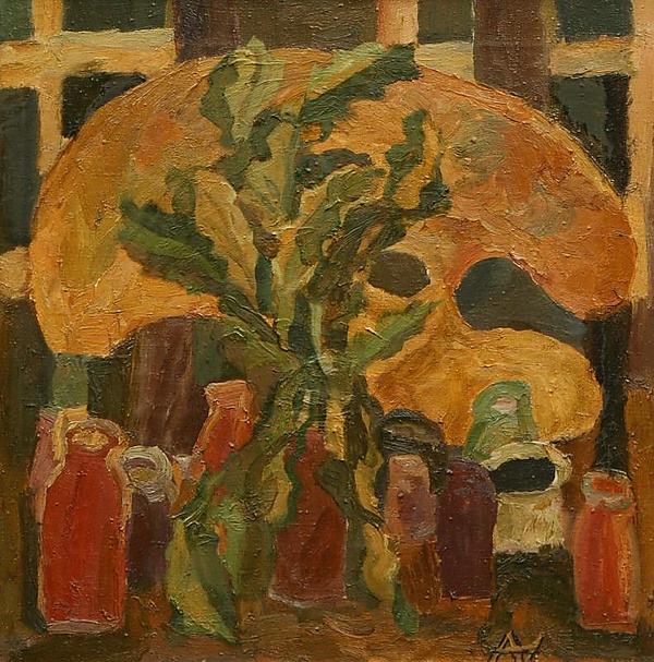 Картина выполнена в квадратном формате с центром композиции, где расположен сосуд с зелёными веточками. На переднем плане на столе изображены сосуды различных форм, расставленные в несколько рядов. Фон выдержан в серо-коричневых тонах. В работе преобладают коричневый, серый и зелёный цвета, что придаёт натюрморту сдержанную и гармоничную цветовую гамму. Изображение отличается реалистичной передачей предметов.