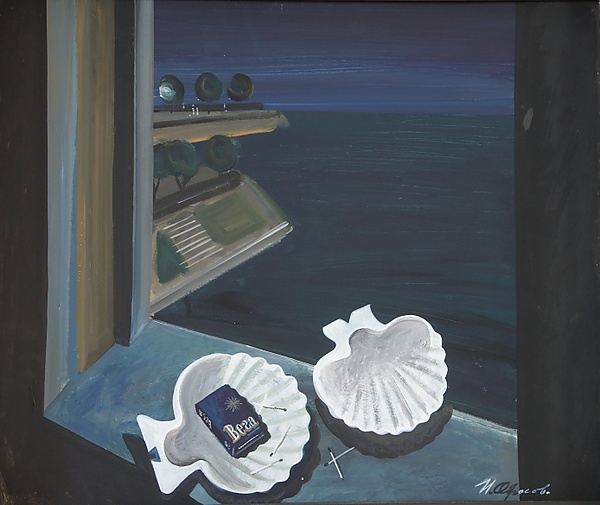 На полотне представлен натюрморт, в центре которого раскрытое окно, занимающее почти всю поверхность композиции и расположенное по диагонали на чёрном фоне. На тёмном серовато-голубом подоконнике размещены две большие белые половинки раковин. В одной из них находится пачка сигарет «Вега» синего цвета с белой подписью, а также четыре спички; ещё две спички лежат справа от раковины. За окном изображён ночной пейзаж: широкое пространство зеленовато-чёрного моря и полоса сине-фиолетового неба, более светлого у горизонта. Слева видна часть двухъярусного сооружения с тёмными прожекторами. На обороте картины наклеен лист бумаги с изображением двух фигур лошадей, стоящих на берегу реки, выполненным чёрной краской.